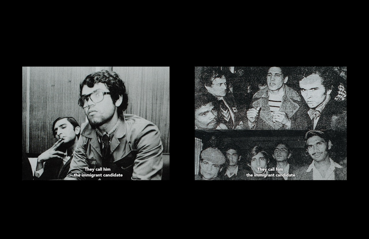 Deux œuvres complètent Astérismes (Fig. 2). Dans The Storytellers (2023), présenté au centre de l’exposition, des membres fondateurs de Al Assifa et Al Halaka récitent des textes manifestes de leur conception du théâtre et de la lutte, jouant des extraits de leur répertoire, courts sketchs et poèmes où il est question du racisme, de leurs conditions de vie et de travail. Cinquante ans après, ils relisent au présent leur engagement théâtral et combat civique. L’installation Timeline for a Constellation (2023) reprend la tradition du journal mural. Cette chronologie constellée offre une histoire forcément parcellaire du MTA et de ses troupes de théâtre, réunissant archives, documentation et extraits de texte pour souligner les connexions et solidarités interpersonnelles et entre collectifs.