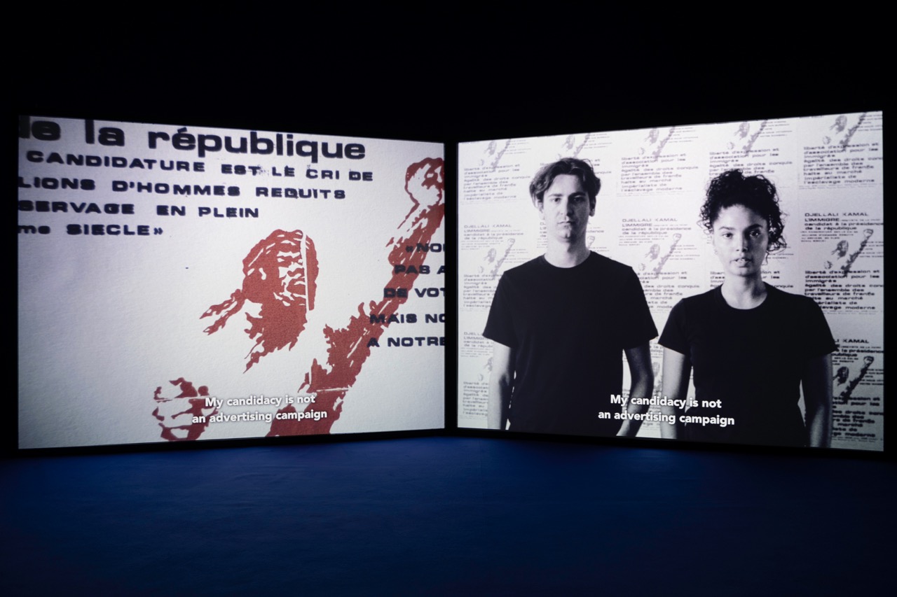 The Public Storyteller (2024) revient aux origines de l’inspiration de Al Assifa et Al Halaka : la tradition ancestrale du conteur public au Maroc et ses rituels. Pour cette oeuvre, Bouchra Khalili invite un jeune conteur marrakchi, qui perpétue cette tradition, à réactiver le récit de la candidature de Djellali Kamal pour faire surgir le spectre qui hante toujours notre présent et nos possibles futurs communs.