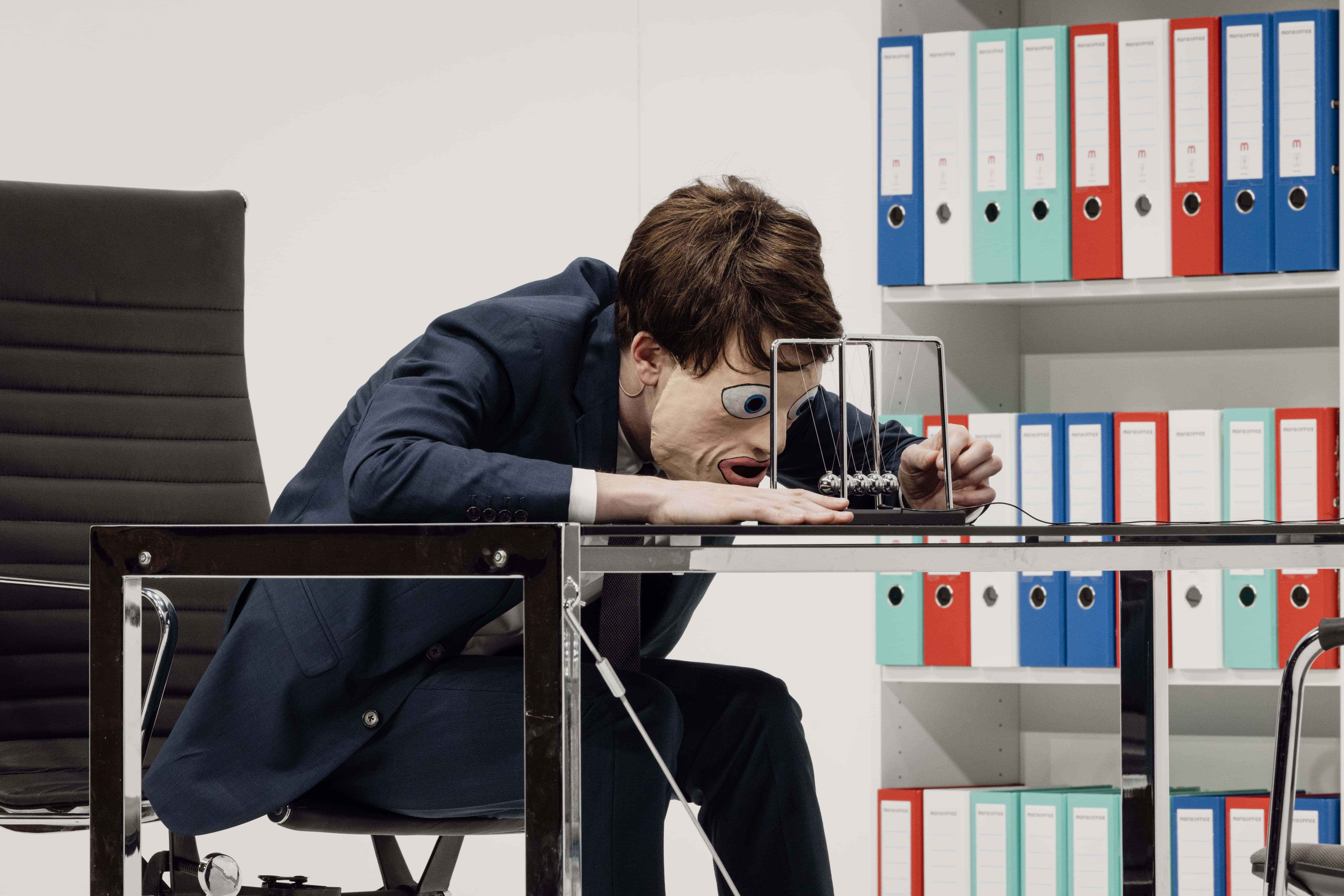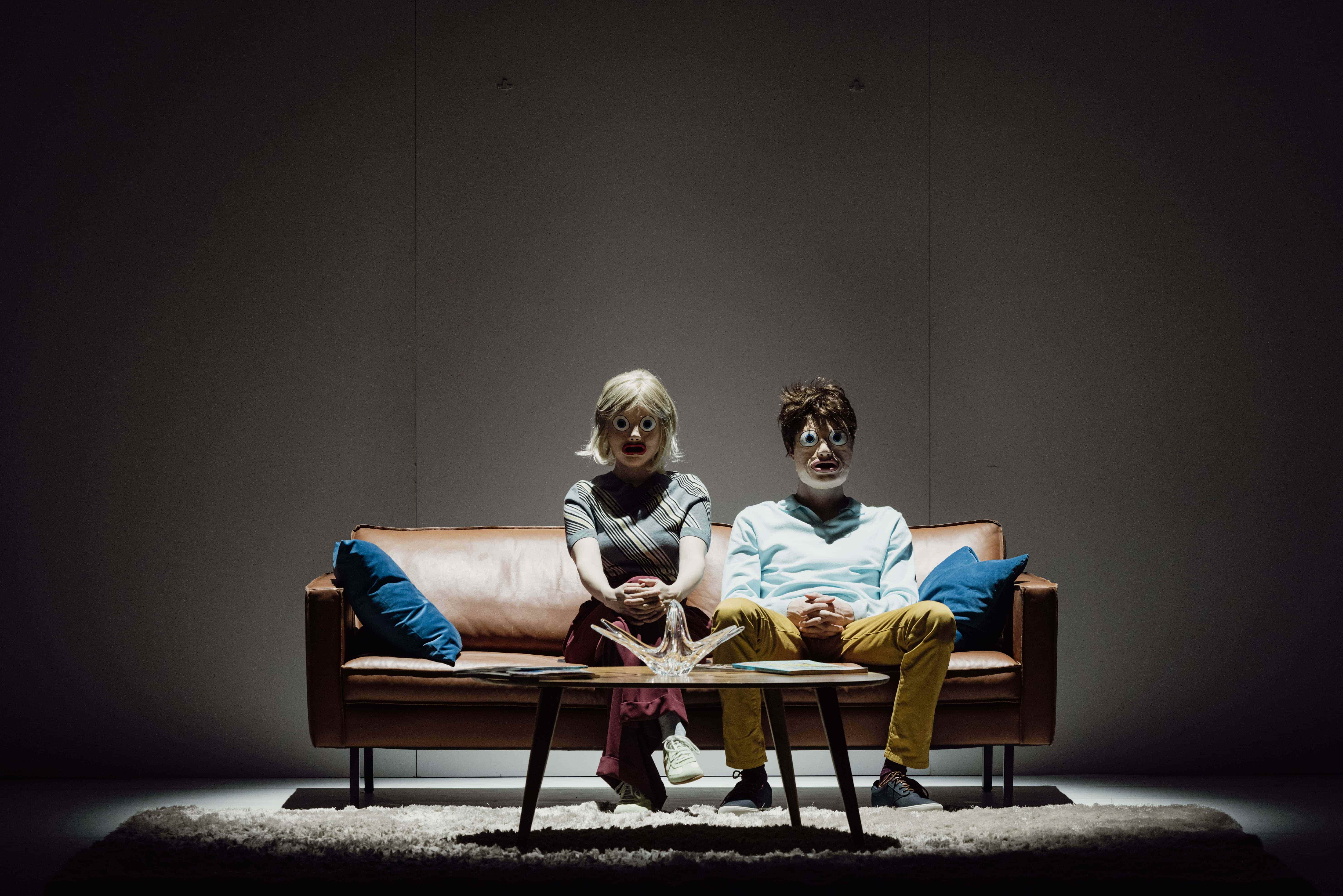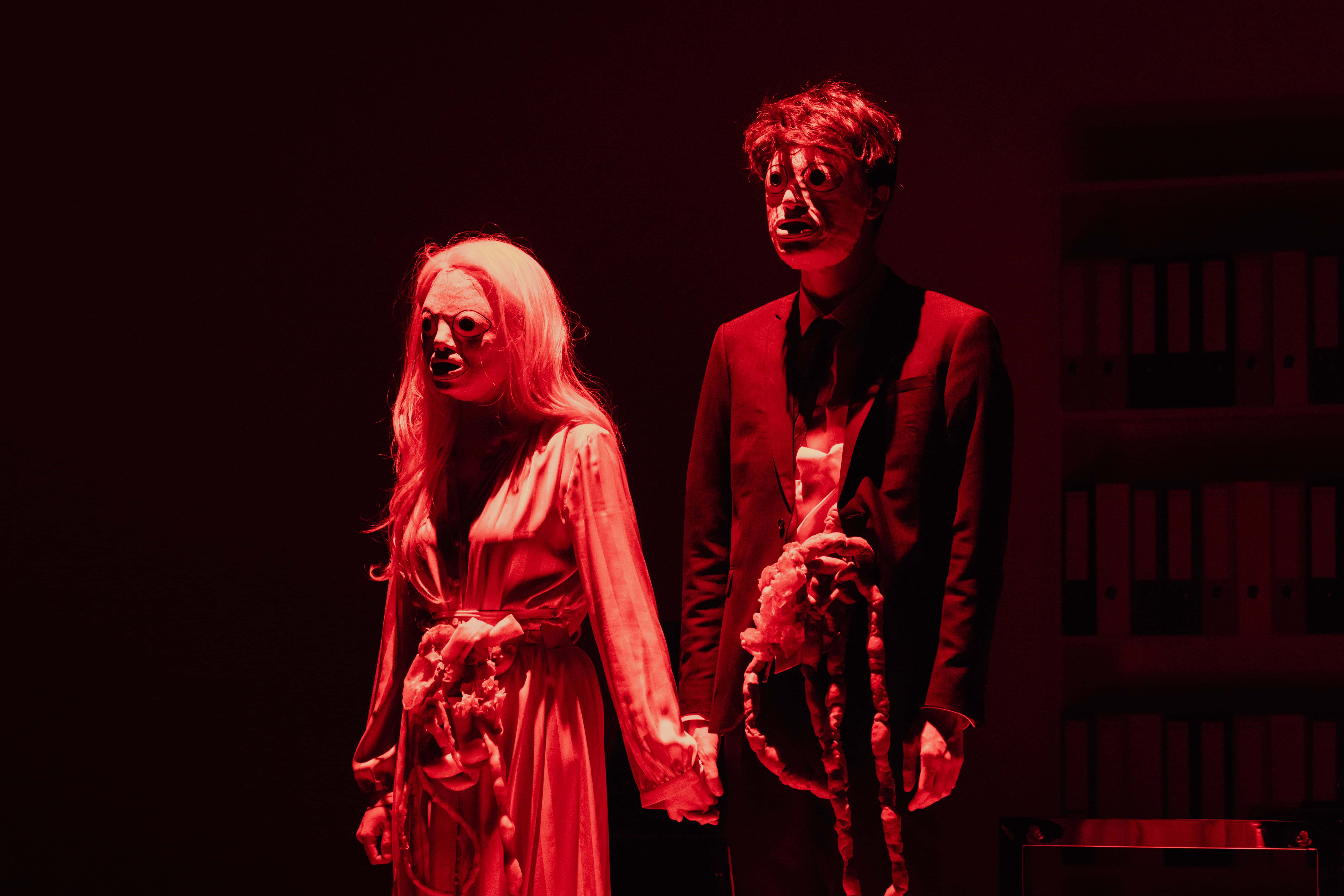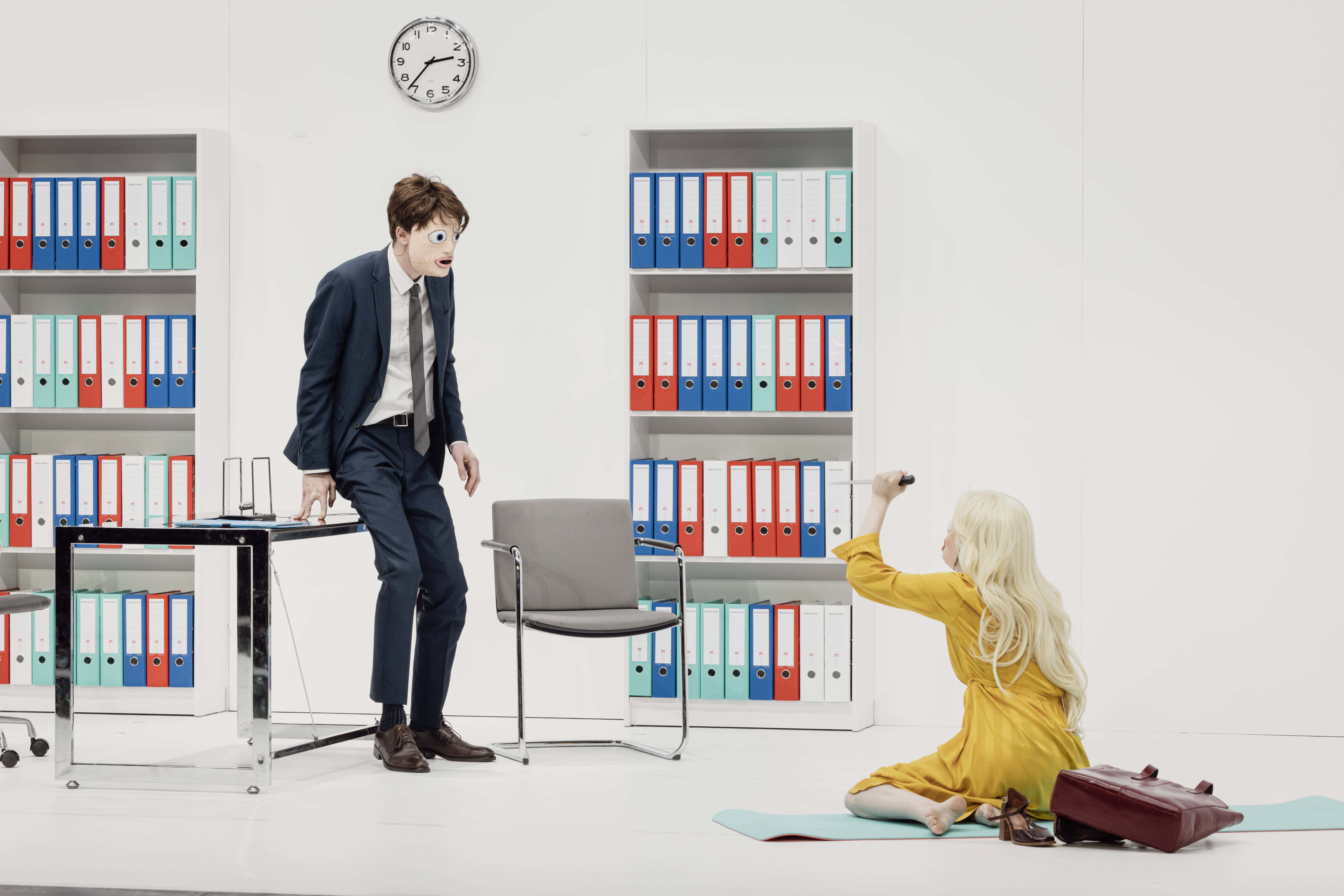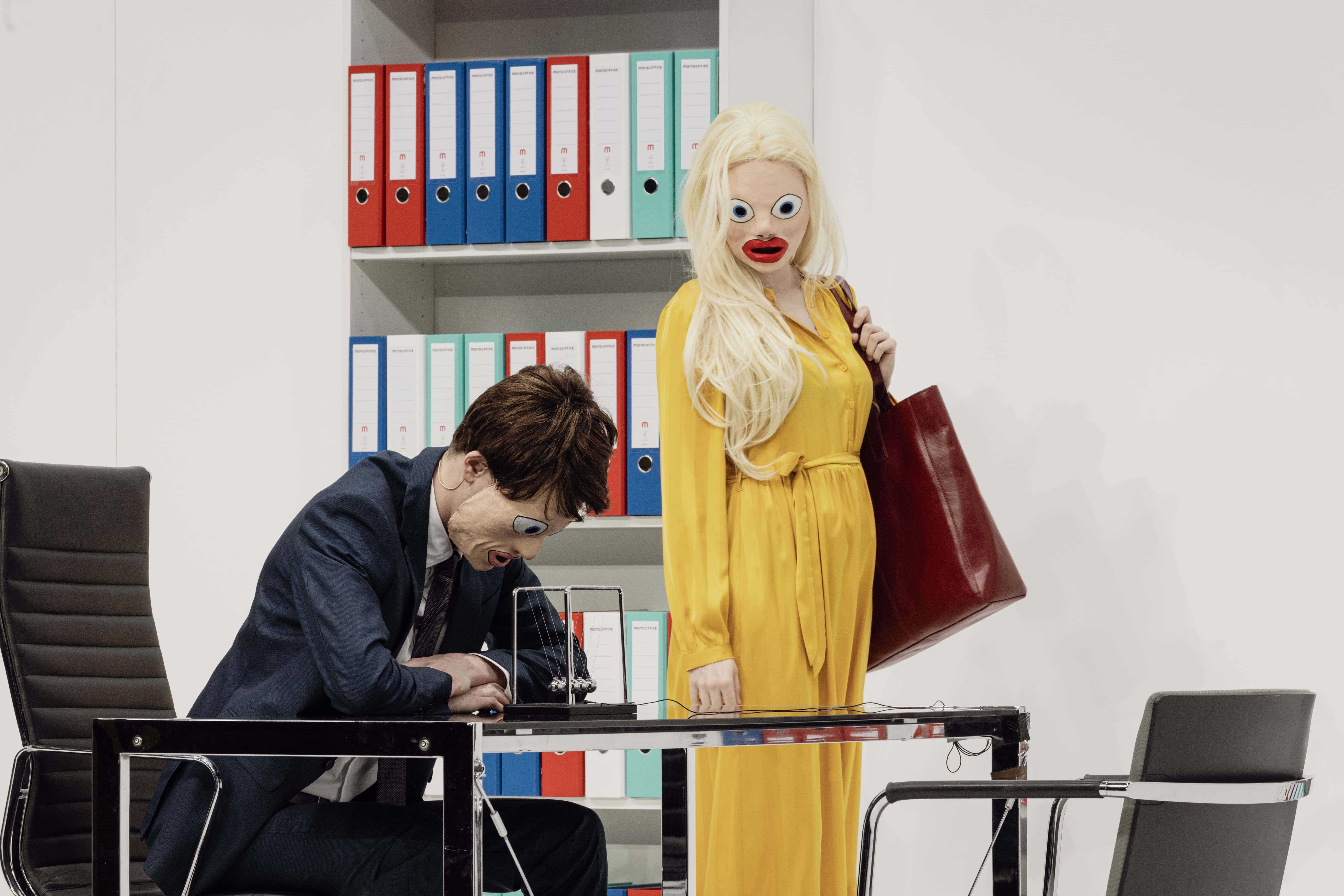 Tourné à l’origine pour la télévision suédoise, Scènes de la vie conjugale (Scener ur ett äktenskap) fut adapté au cinéma par Bergman en 1973. Le film retrace, sur dix ans, l’évolution du mariage de Johan, professeur d’université, et de Marianne, avocate spécialisée en droit de la famille. Au fil de rencontres successives, marquant les tournants et la faillite de leur relation, se dessine le portrait d’un couple dont l’issue semble inextricable — peu à peu incapable d’être ensemble, mais tout aussi incapable de se séparer. Adapté une première fois en 2023, Markus Öhrn s’empare à nouveau de Scènes de la vie conjugale, dans une version tout à fait inédite, portée cette fois par une distribution française. L’occasion de relire la fable bergmanienne à l’aune des violences domestiques — physiques et psychologiques — qui surgissent dans le secret et l’enceinte de nombreux couples. Pour ce faire, le metteur en scène transpose le film de Bergman dans un univers ubuesque, refusant toute forme de réalisme. Au milieu des murs décapés d’une « boîte blanche », affublés de masques grotesques, Johan et Marianne deviennent les avatars d’un jeu cruel et ridicule, qui évoque autant la tradition du Grand-Guignol que la violence saturée de certains cartoons. Cette violence désinhibée, volontiers excessive et caricaturale, est tendue au public tel un miroir déformant — reflet probable de nos propres pulsions refoulées, ou simplement dissimulées derrière la mascarade sociale.
